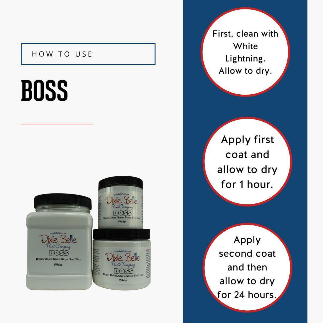 Clean first with White Lightning and then apply BOSS. Allow to dry approximately one hour. Apply a second coat of BOSS and allow to dry for 24 hours before painting with Dixie Belle Paint.